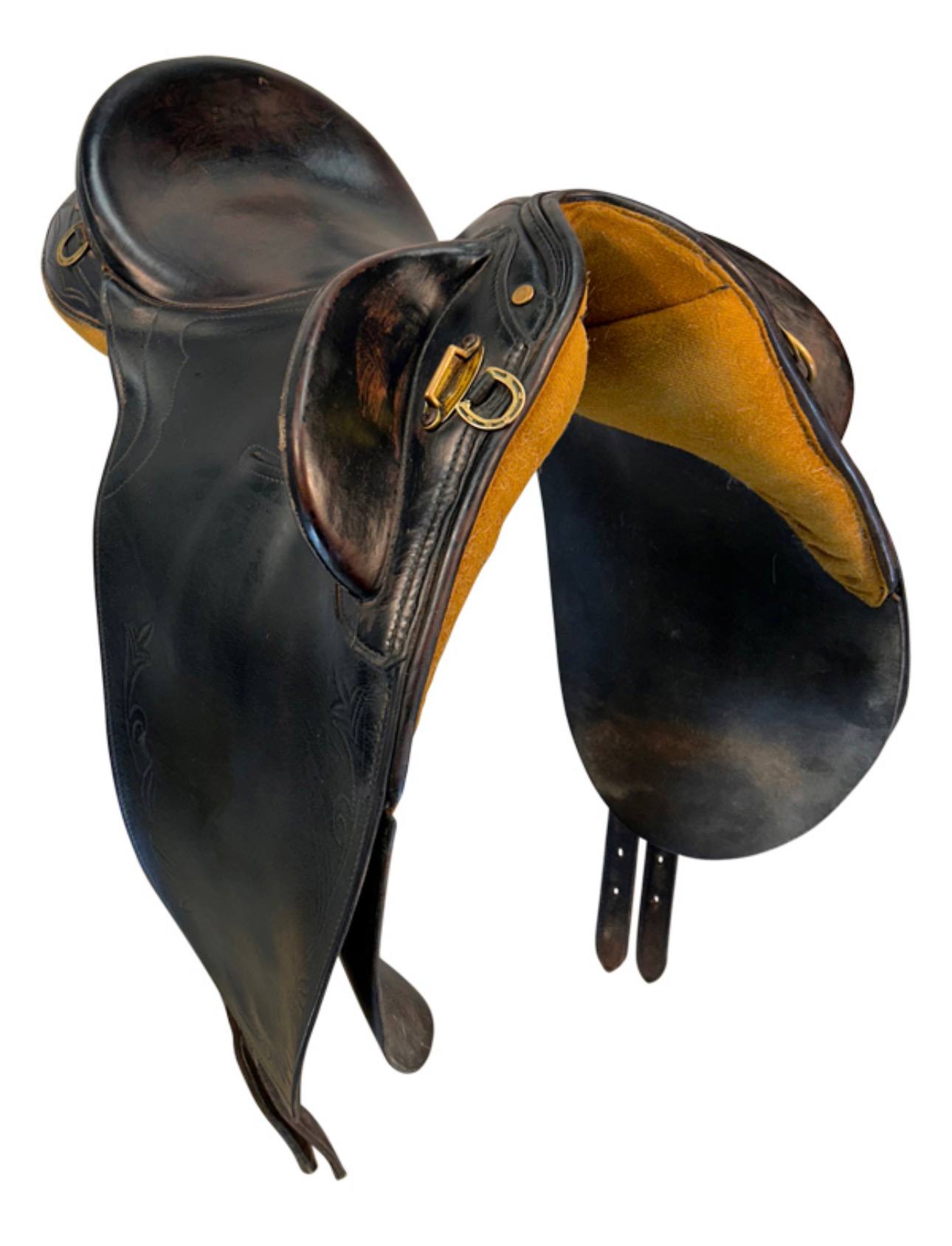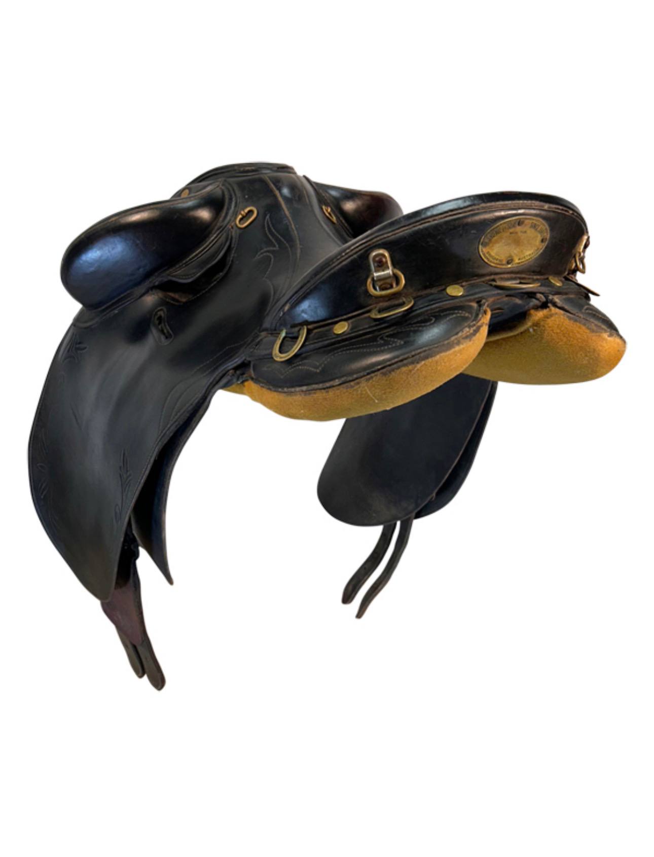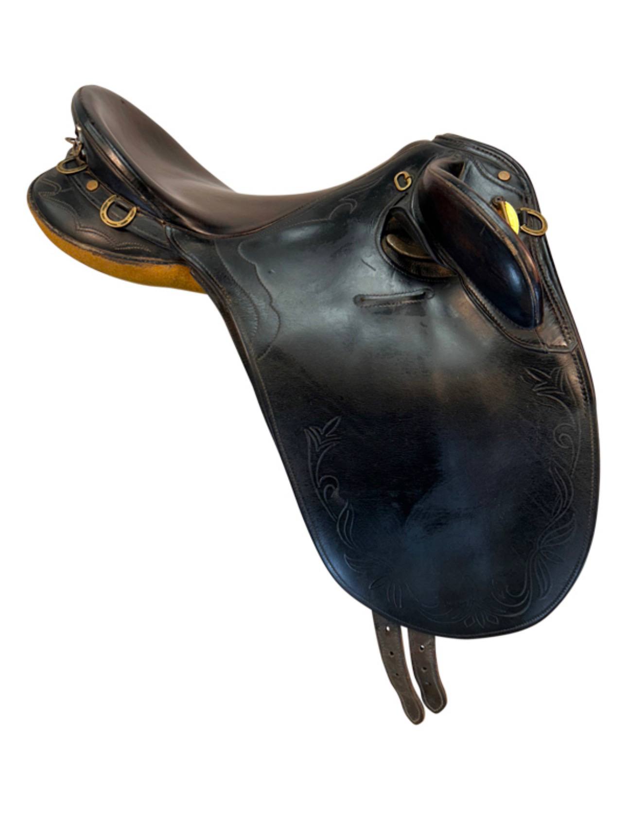 he 15 Inch Used Syd Hill And Sons Dorrigo Australian Saddle is a classic, well-respected stock saddle built for comfort and security on the trail or ranch. Crafted by the renowned Australian saddlery Syd Hill And Sons, the Dorrigo model features a deep, supportive 15-inch seat with high knee pads that help keep the rider firmly positioned during challenging terrain or quick movements.
