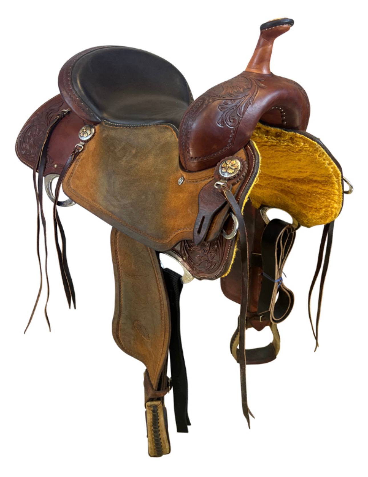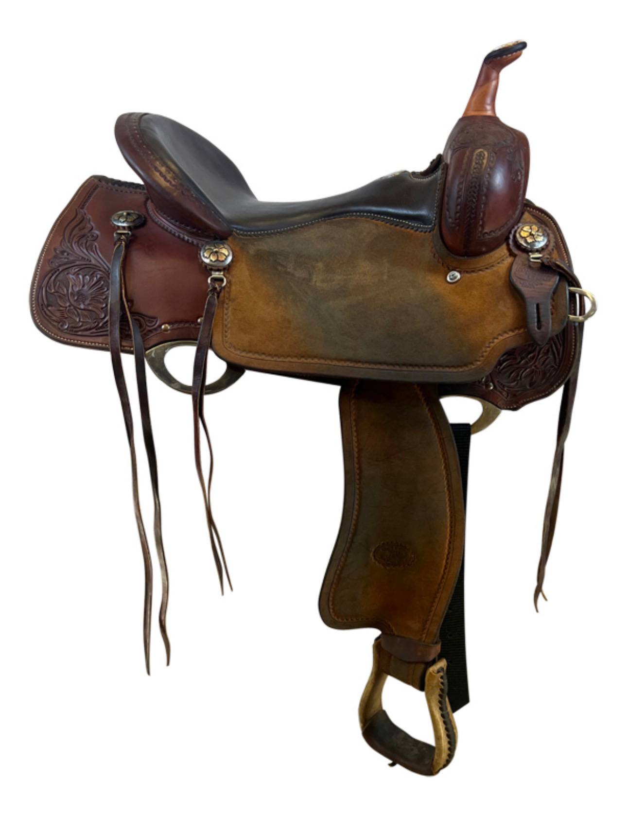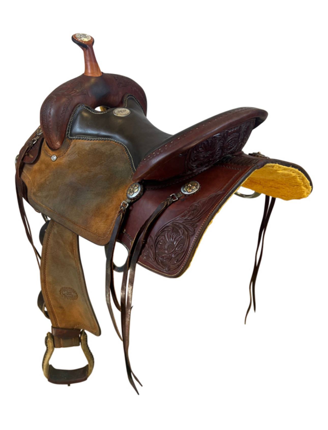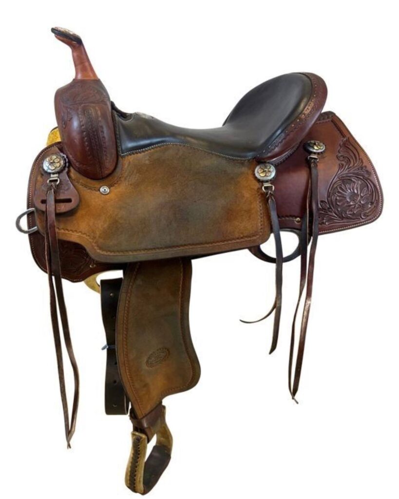Built with Billy Cook’s legendary premium leather and featuring attractive “Cats Eye” tooling, this saddle delivers both beauty and function. The lightweight design, strong tree, and well-positioned stirrups help the rider stay balanced and effective through every run. This used saddle has developed honest character from real arena use while remaining supple, sound, and fully ready for fast runs.