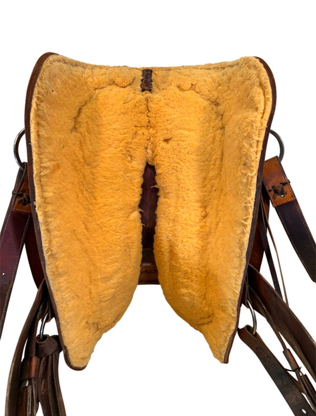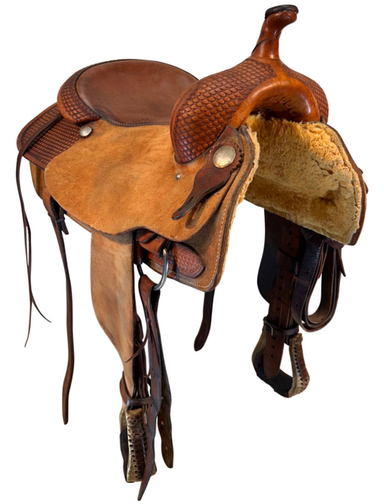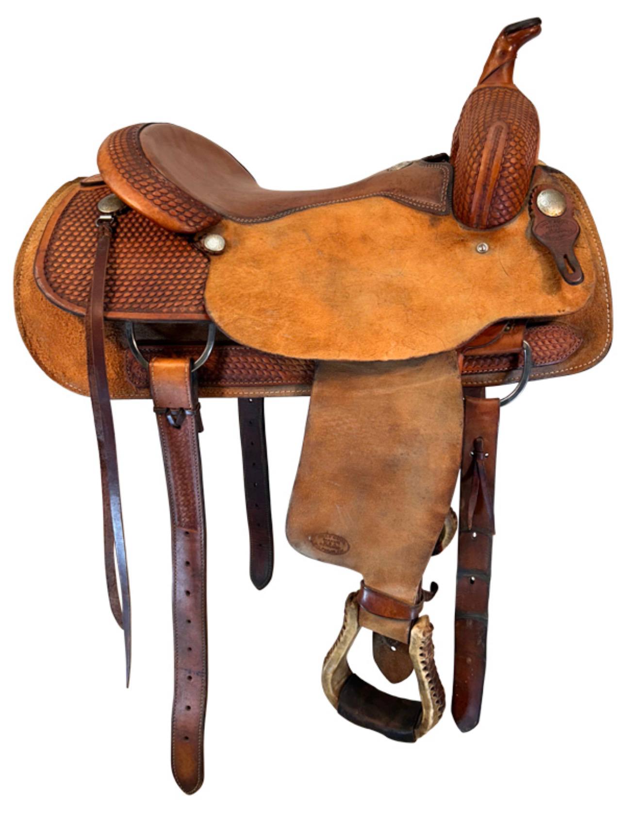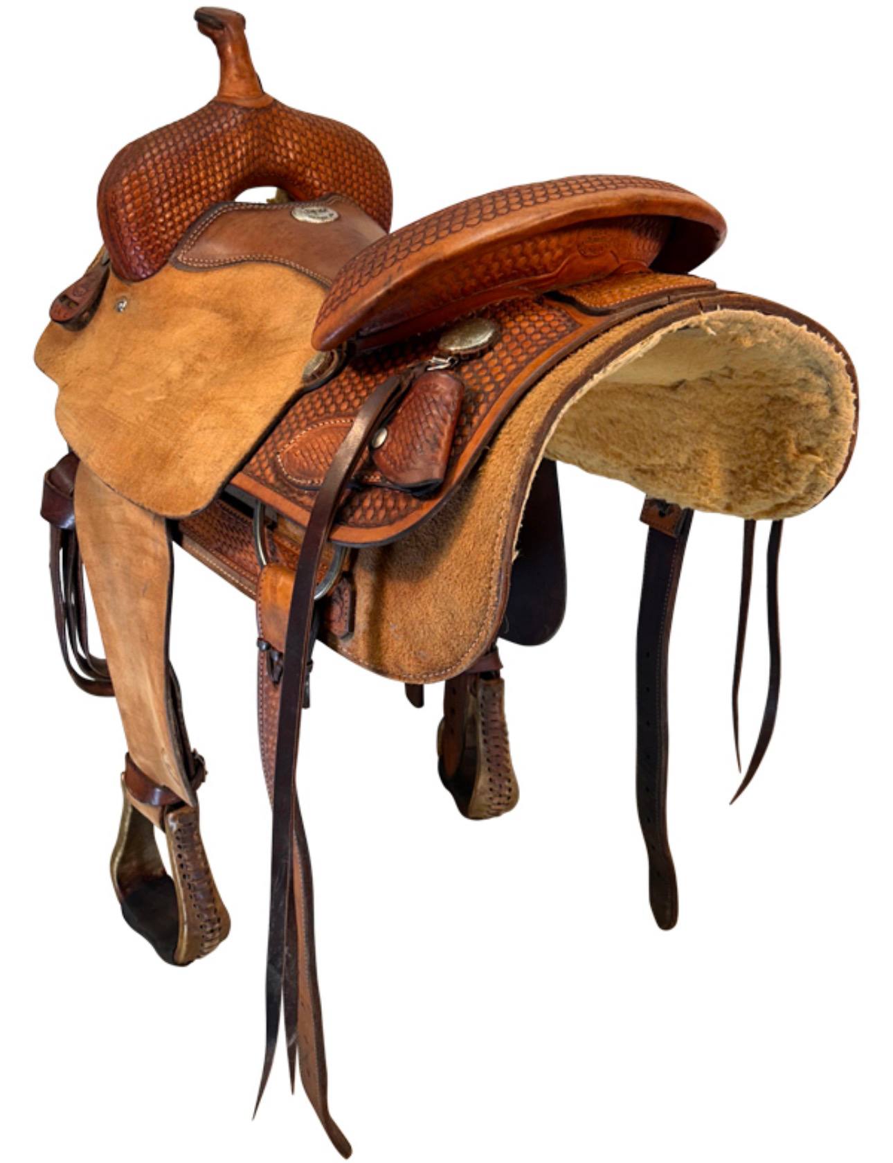 16″ Used Billy Cook Cutting Saddle – Wide Tree (4042). A purpose-built cutting saddle with a deep 16″ dished seat, high cantle, and wide tree for broader horses. Legendary Billy Cook quality designed for security and fast cutting moves.