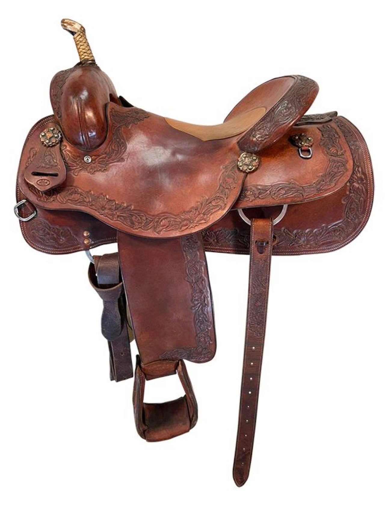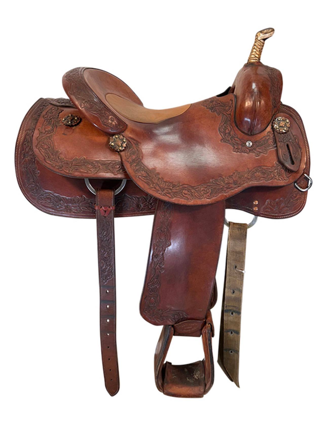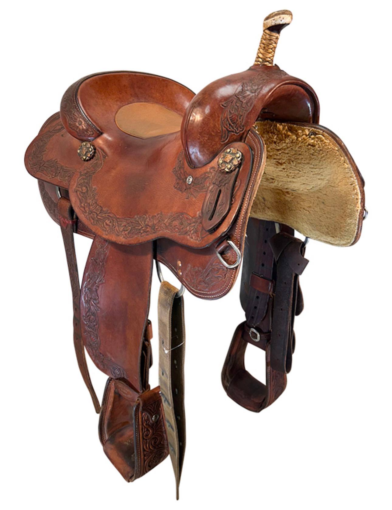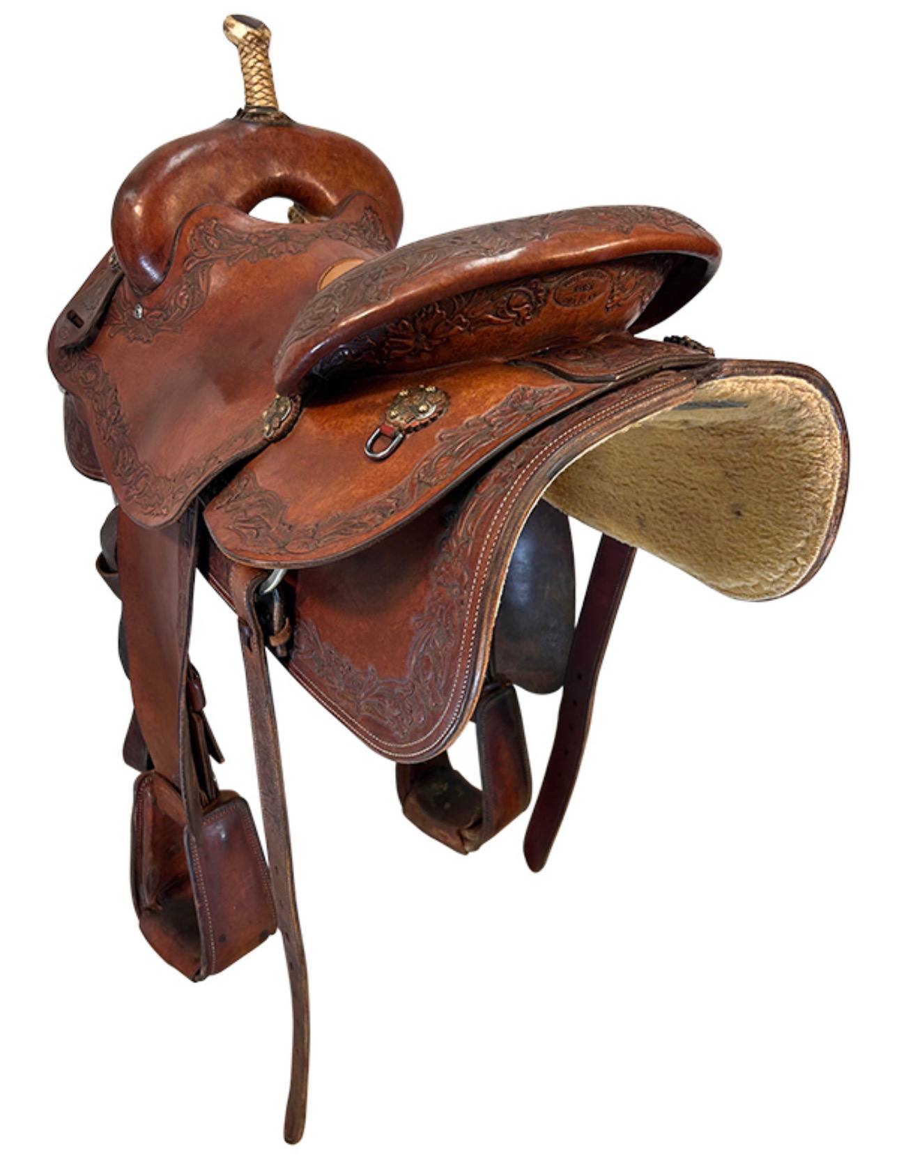 Built with top-quality leather and clean, functional detailing, this saddle includes a low, slick horn typical of serious cutting saddles, along with heavy-duty rigging designed to handle the intense demands of cutting work. The leather has developed a rich, honest patina from real arena and ranch use, while remaining supple and comfortable. This used saddle is in excellent condition and ready for many more competitive runs or hard working days.