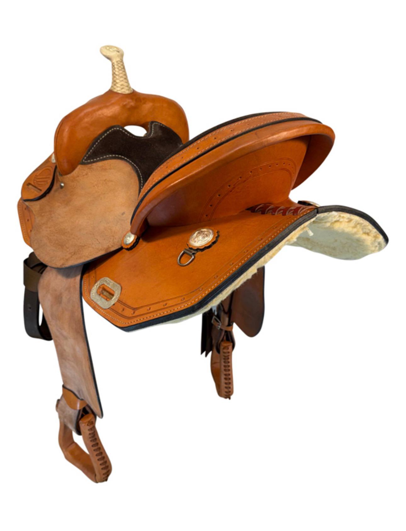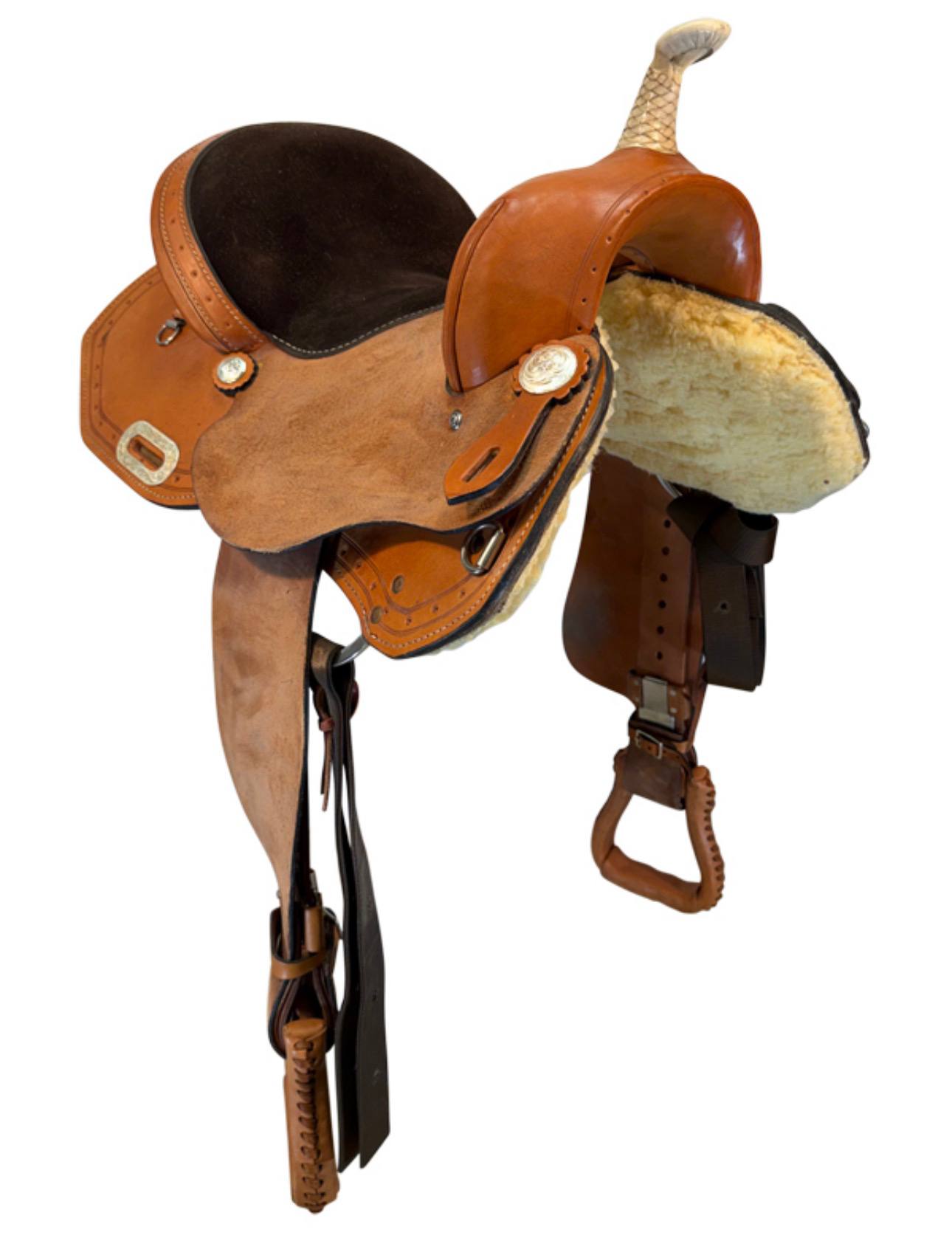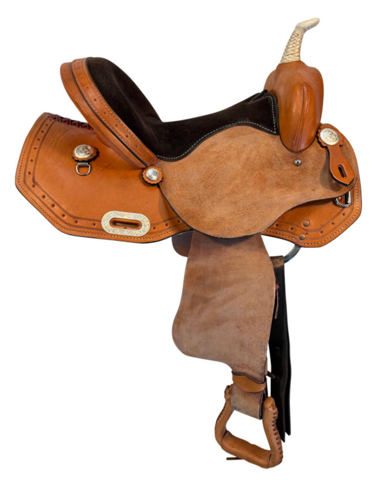 Featuring a 16-inch seat, it offers a spacious and comfortable ride, ideal for riders who prefer a bit more room while maintaining stability during high-speed runs. The roughout leather provides extra grip, helping you stay secure in the saddle during sharp turns and fast-paced barrel racing.