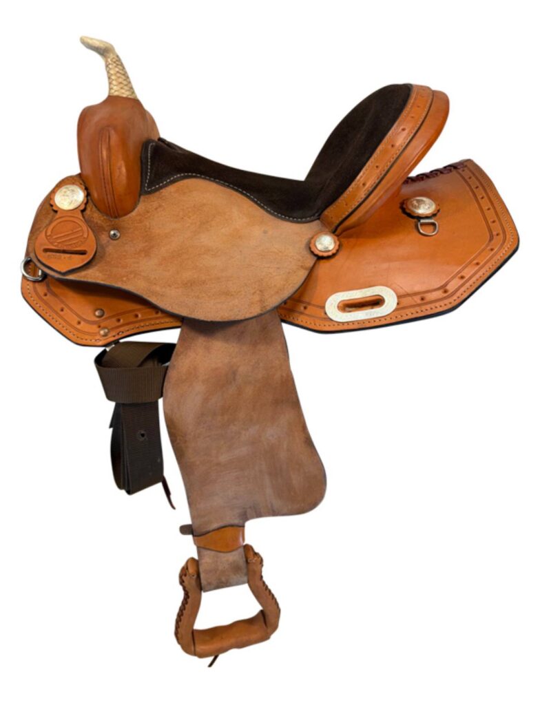 The 16” Used Billy Cook Roughout Floral Barrel Saddle (Model 1935) combines rugged performance with classic western style. Built by Billy Cook Saddlery, this saddle is known for its durability, craftsmanship, and dependable performance in the arena.