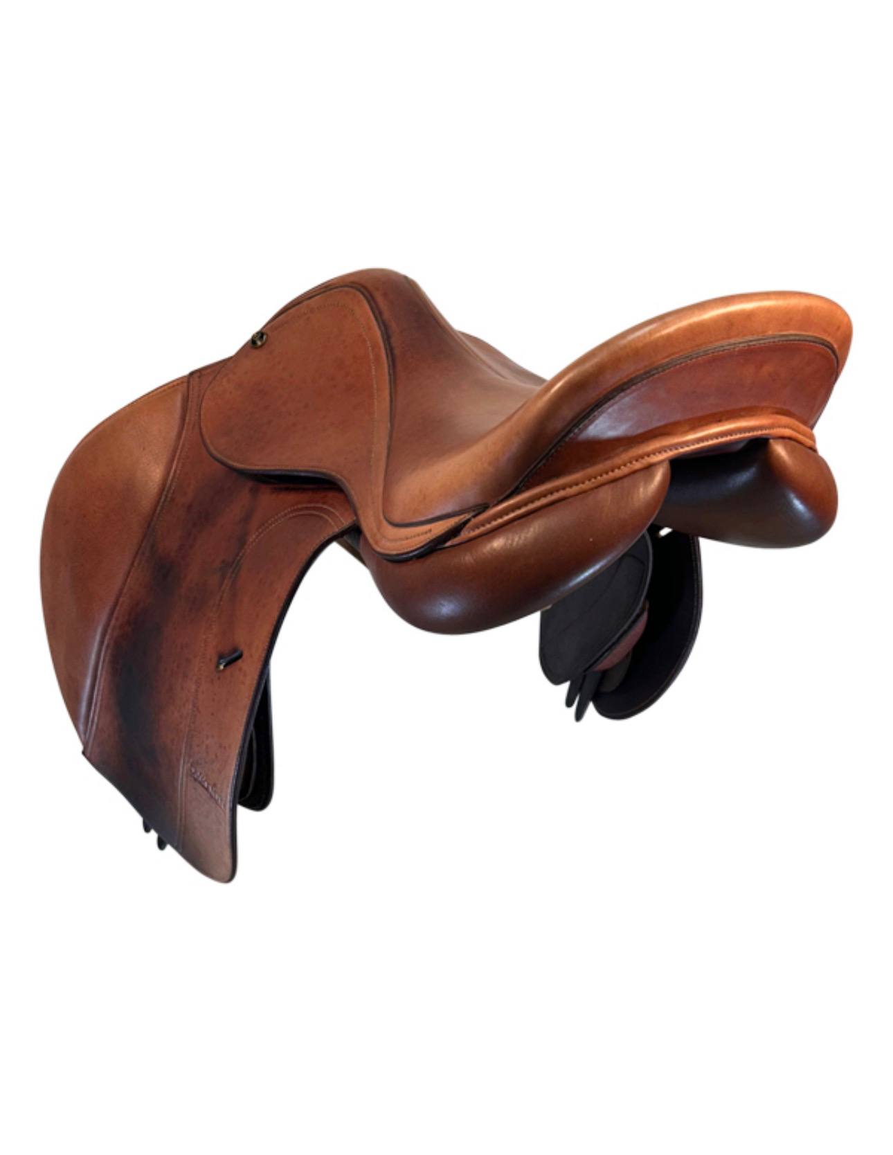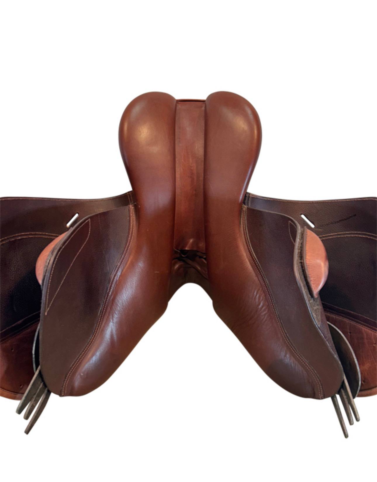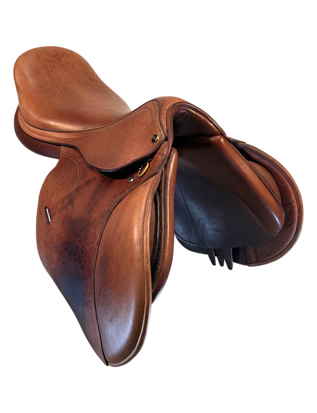 Crafted with high-quality leather that has developed a nice patina from use, this saddle features classic close contact styling with attractive stitching and clean lines. The forward flap design and properly positioned stirrup bars encourage a correct, effective jumping position while remaining comfortable for longer flatwork sessions. This used saddle remains supple and in good serviceable condition, ready for many more rides in the arena or on the trail.
