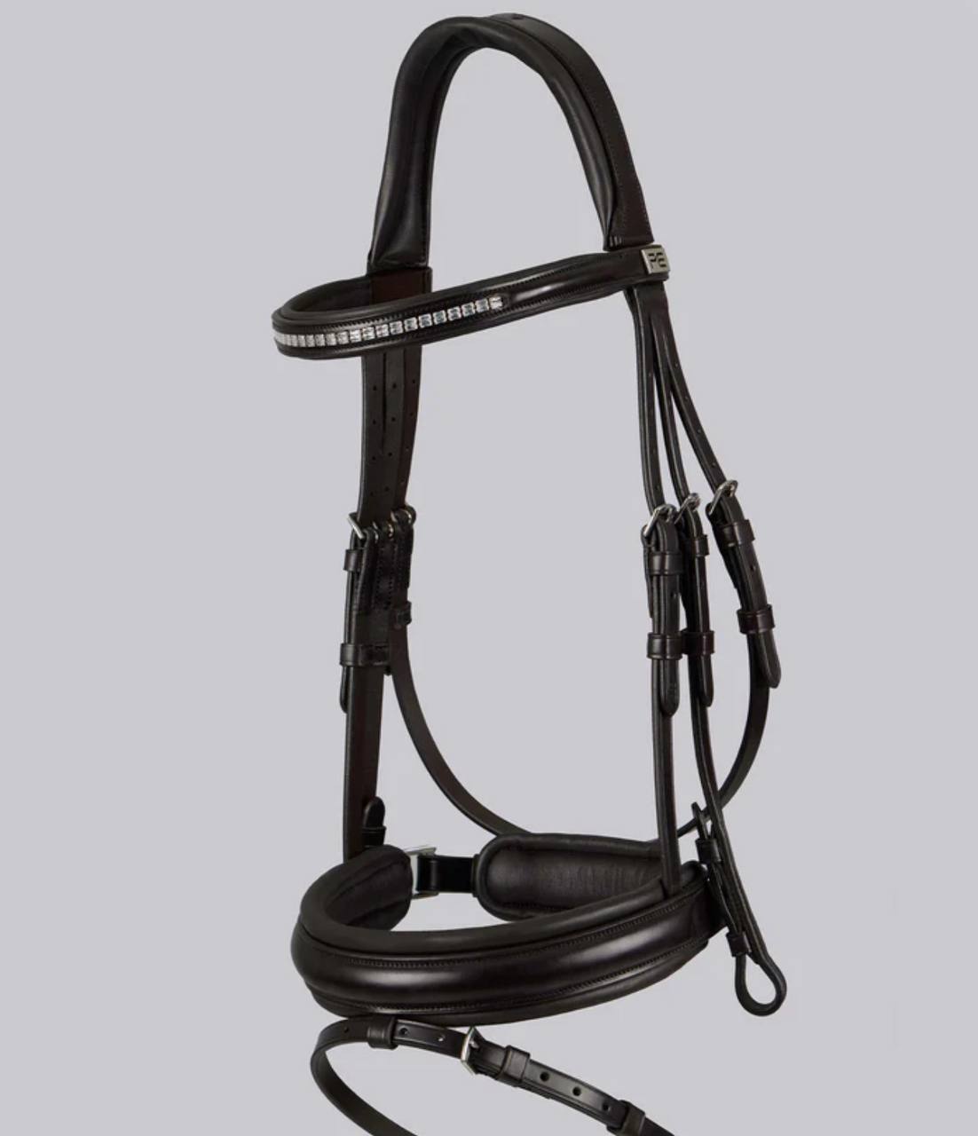 The Castello Anatomical Bridle in Brown is thoughtfully designed to enhance your horse’s comfort and responsiveness. Its anatomical headpiece helps reduce pressure on sensitive areas such as the poll and cheeks, promoting relaxation and improved performance. Crafted from high‑quality brown leather with fine stitching and sturdy hardware, this bridle offers long‑lasting durability and a timeless, elegant look. Fully adjustable buckles allow for a secure, customized fit—perfect for training, dressage, or everyday riding.