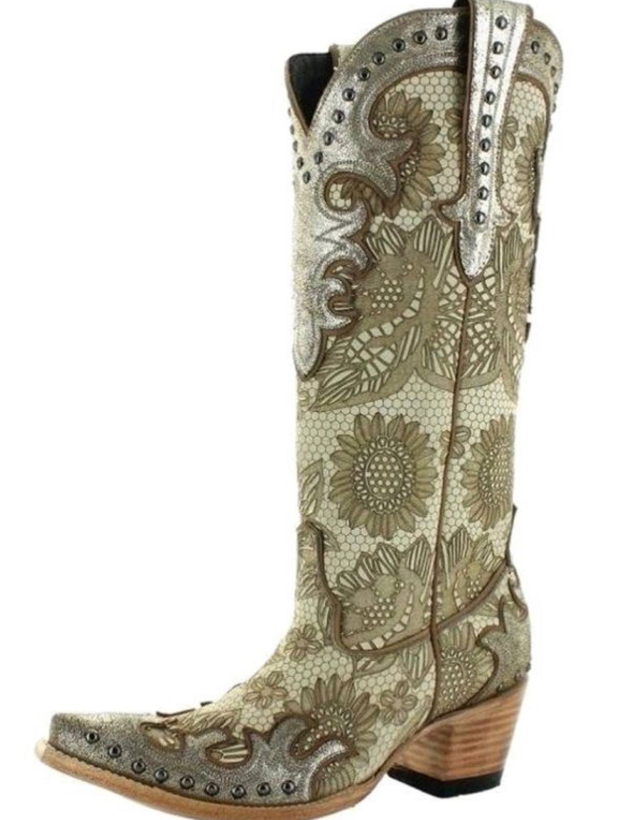 This eye-catching fashion boot features premium leather with intricate hand-tooled patterns, beautiful stitching, and distinctive embellishments that showcase the signature Double D Ranch aesthetic — elegant yet edgy, feminine yet powerful. The shaft height and elegant toe shape create a flattering silhouette, while the comfortable footbed and supportive construction ensure you can wear these boots all day or all night without sacrificing style.