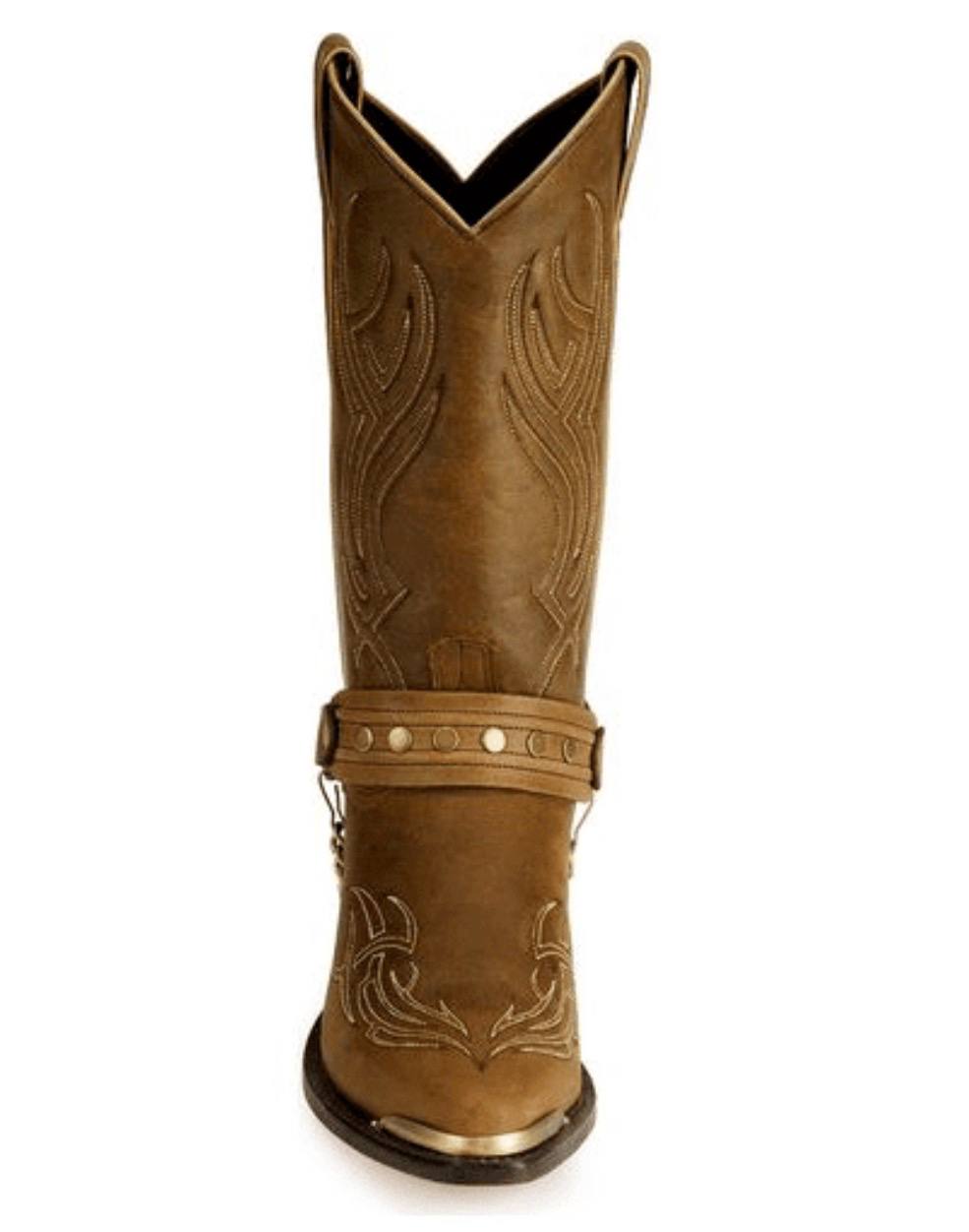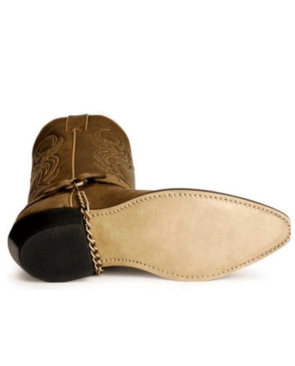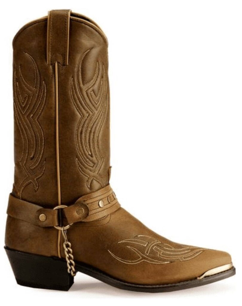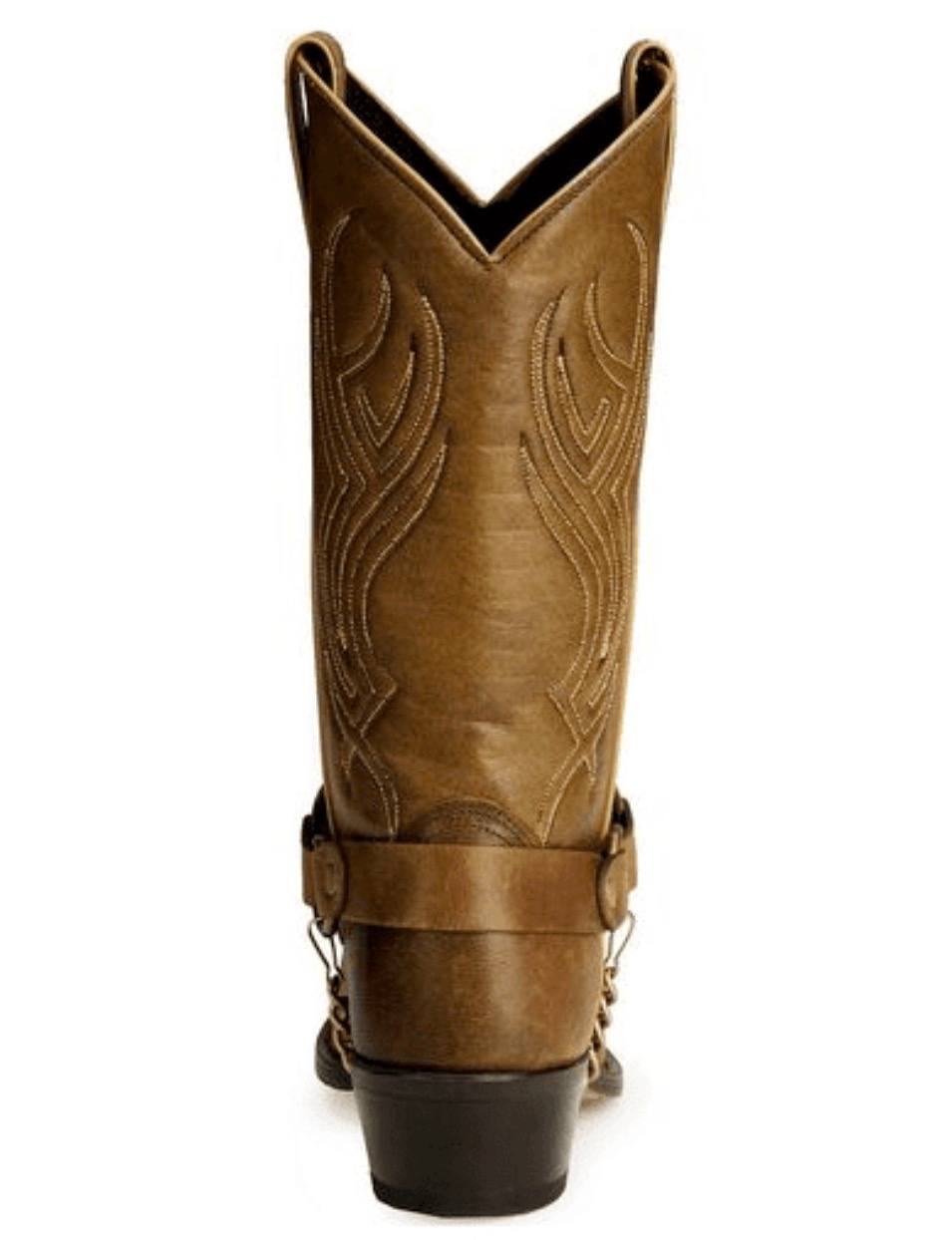 Crafted with a brown leather foot and a 12-inch distressed brown urethane shaft, these boots feature eye-catching western details including tribal-inspired stitching, decorative toe rands, and a studded harness with chain accents for a rugged yet stylish look. The classic snip toe design and 1.5-inch western heel provide a traditional cowboy boot silhouette that works perfectly for riding, ranch work, or casual western wear.
