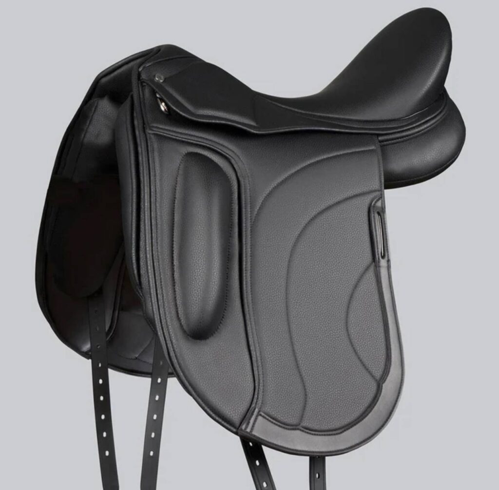 The Montpellier Synthetic Dressage Saddle in Black is designed to support correct rider position, comfort, and elegance in dressage riding. Made from high-quality synthetic materials, it is lightweight, durable, and easy to maintain, making it ideal for everyday training and competition. The deep, balanced seat and supportive knee blocks encourage a stable, upright posture and close contact with the horse. Finished in a classic black color, this saddle delivers a professional look with practical performance.