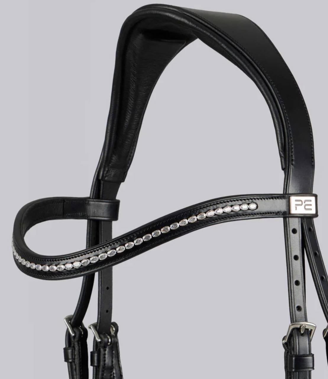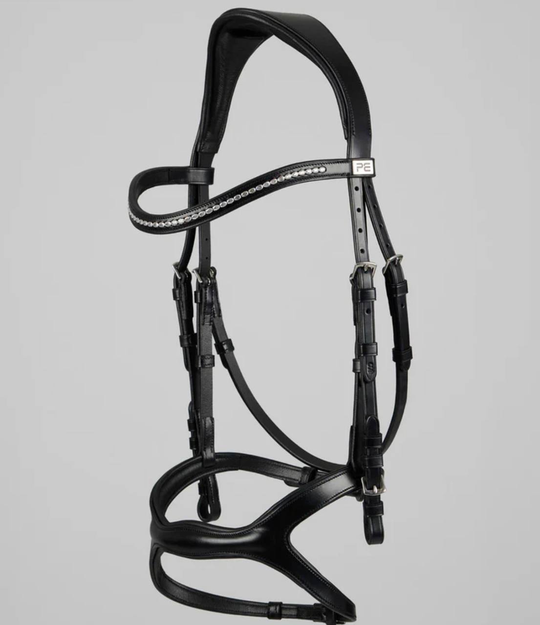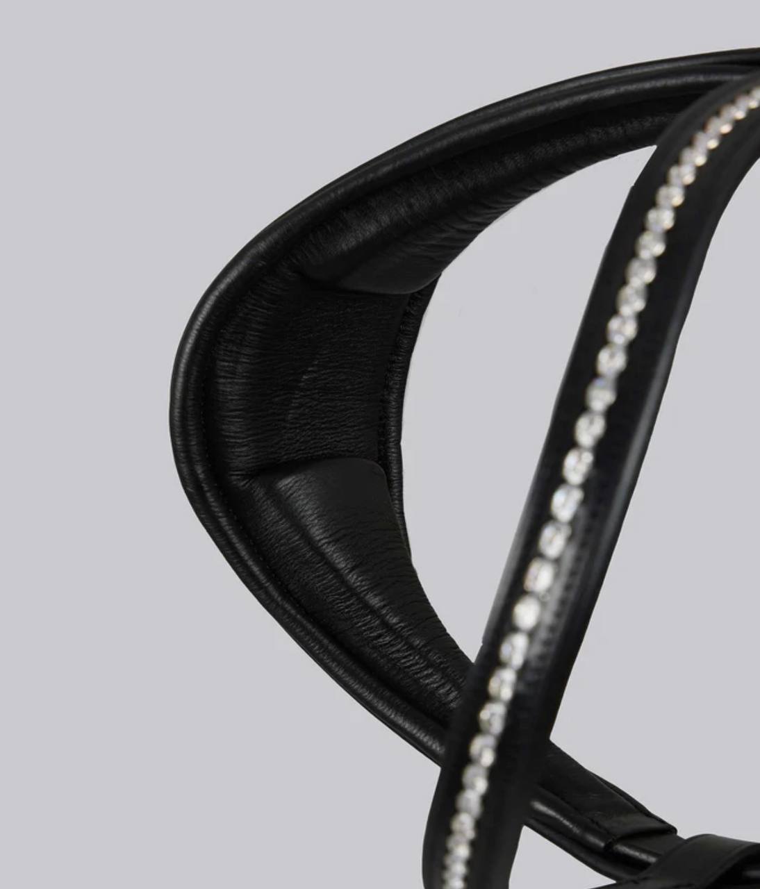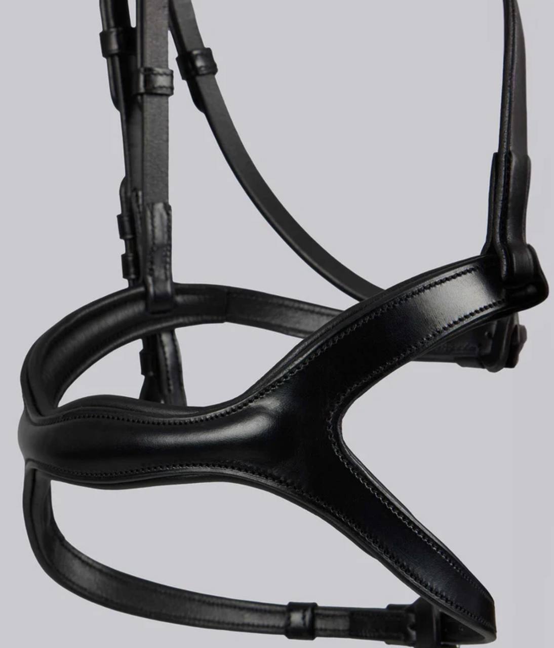 Black anatomical bridle designed for comfort and performance—pressure-relieving shape with quality materials and adjustable fit.