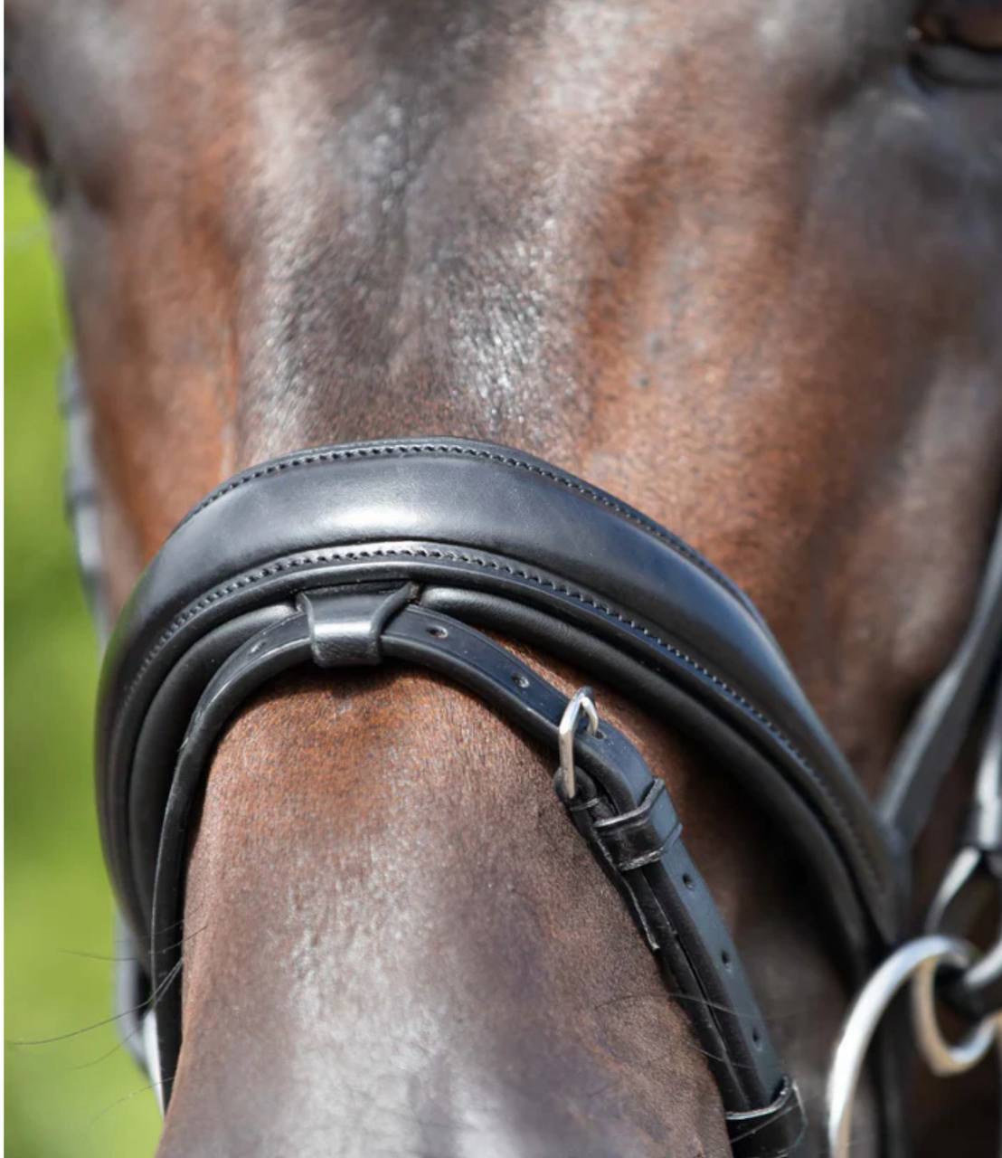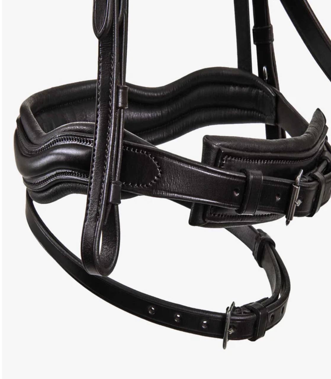 Black anatomical snaffle bridle with flash noseband — pressure‑relieving design with adjustable fit for comfort, control, and performance.