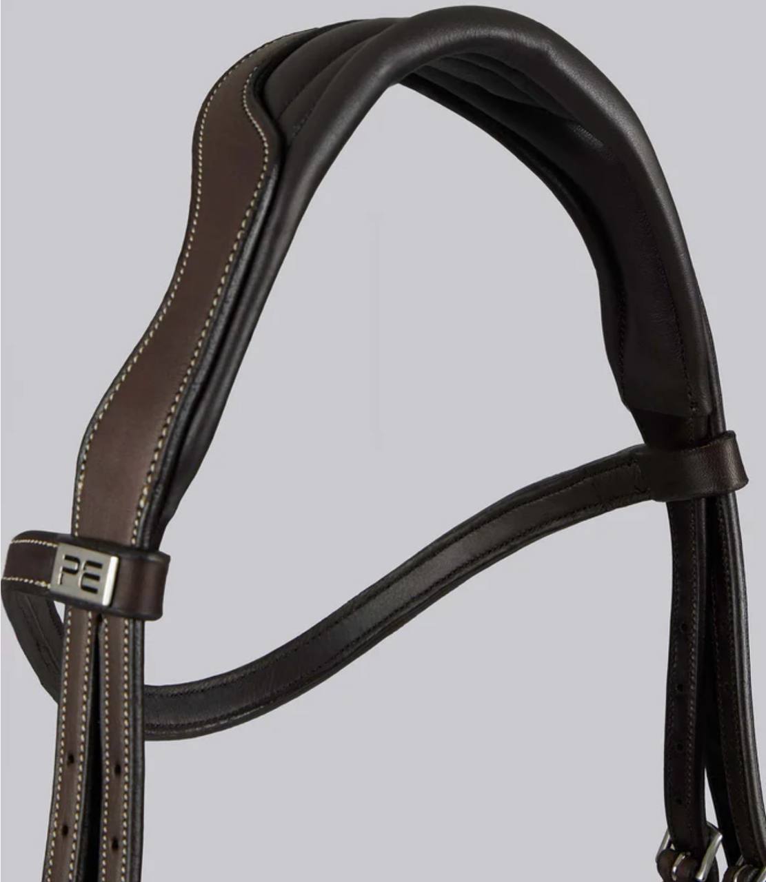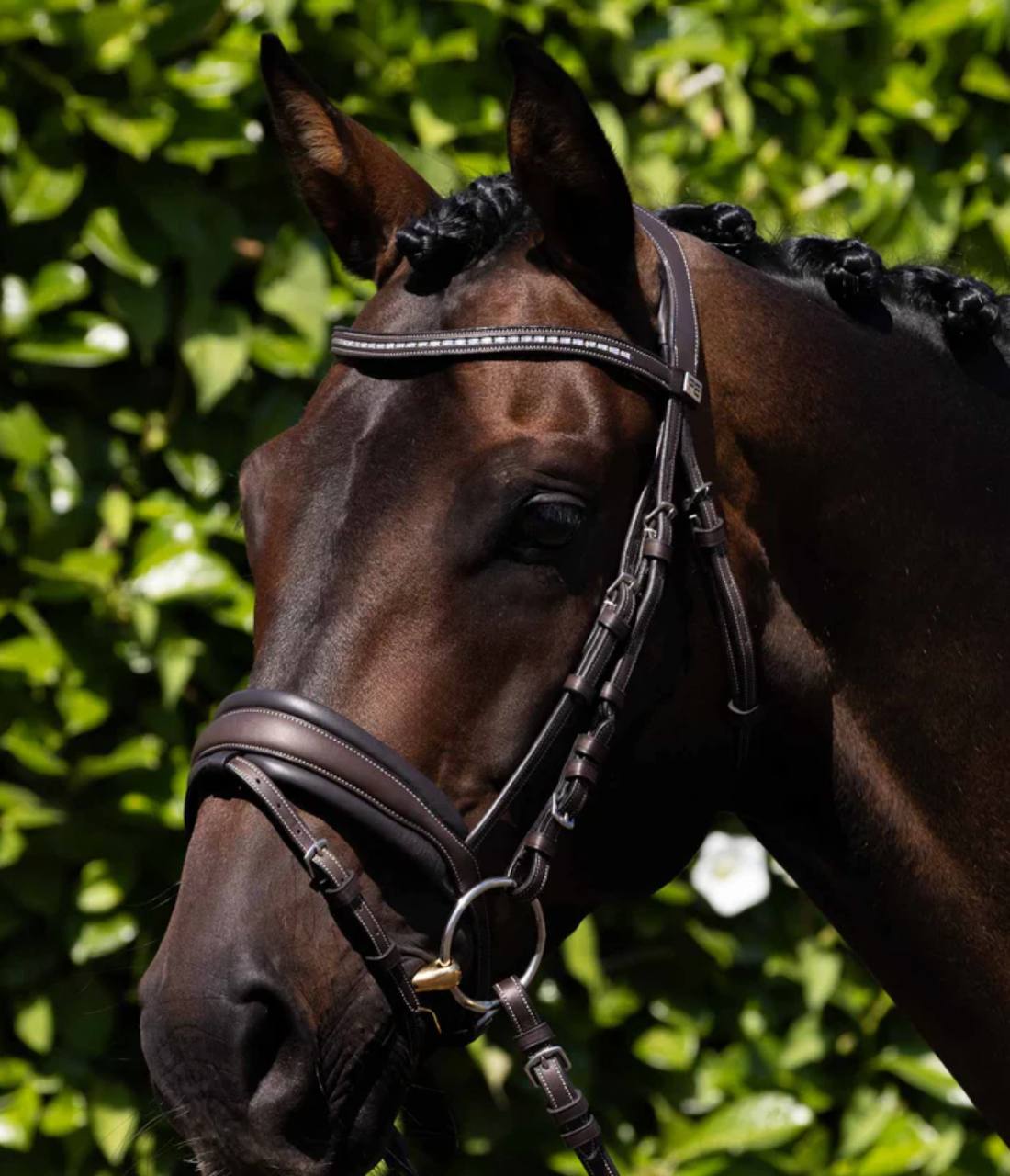 Black anatomical snaffle bridle — pressure‑relieving design with adjustable fit for comfort, control, and performance.