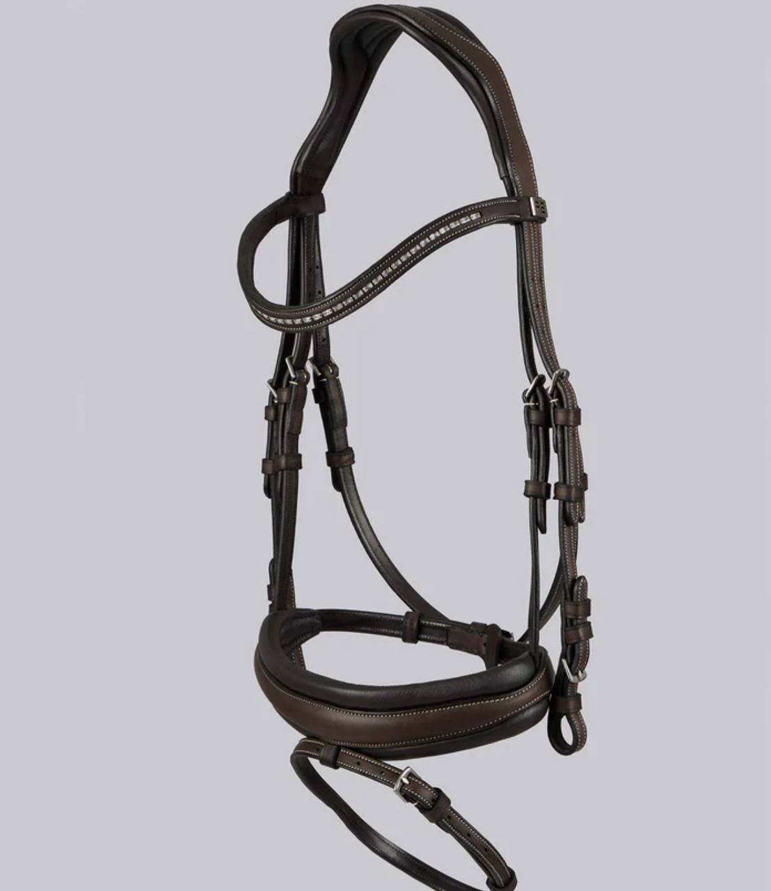The Veneto Anatomical Snaffle Bridle in Black is expertly designed to enhance your horse’s comfort and improve rider communication. With its anatomical headpiece, this bridle reduces pressure on sensitive areas like the poll and cheeks, promoting relaxation and responsiveness. Crafted from premium black leather with refined stitching and quality hardware, it offers durability and a sleek, professional look. Fully adjustable buckles ensure a secure, customized fit—perfect for training, dressage, or everyday riding.
