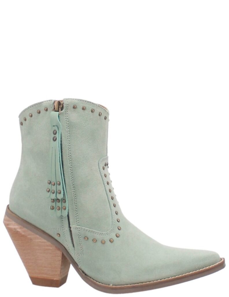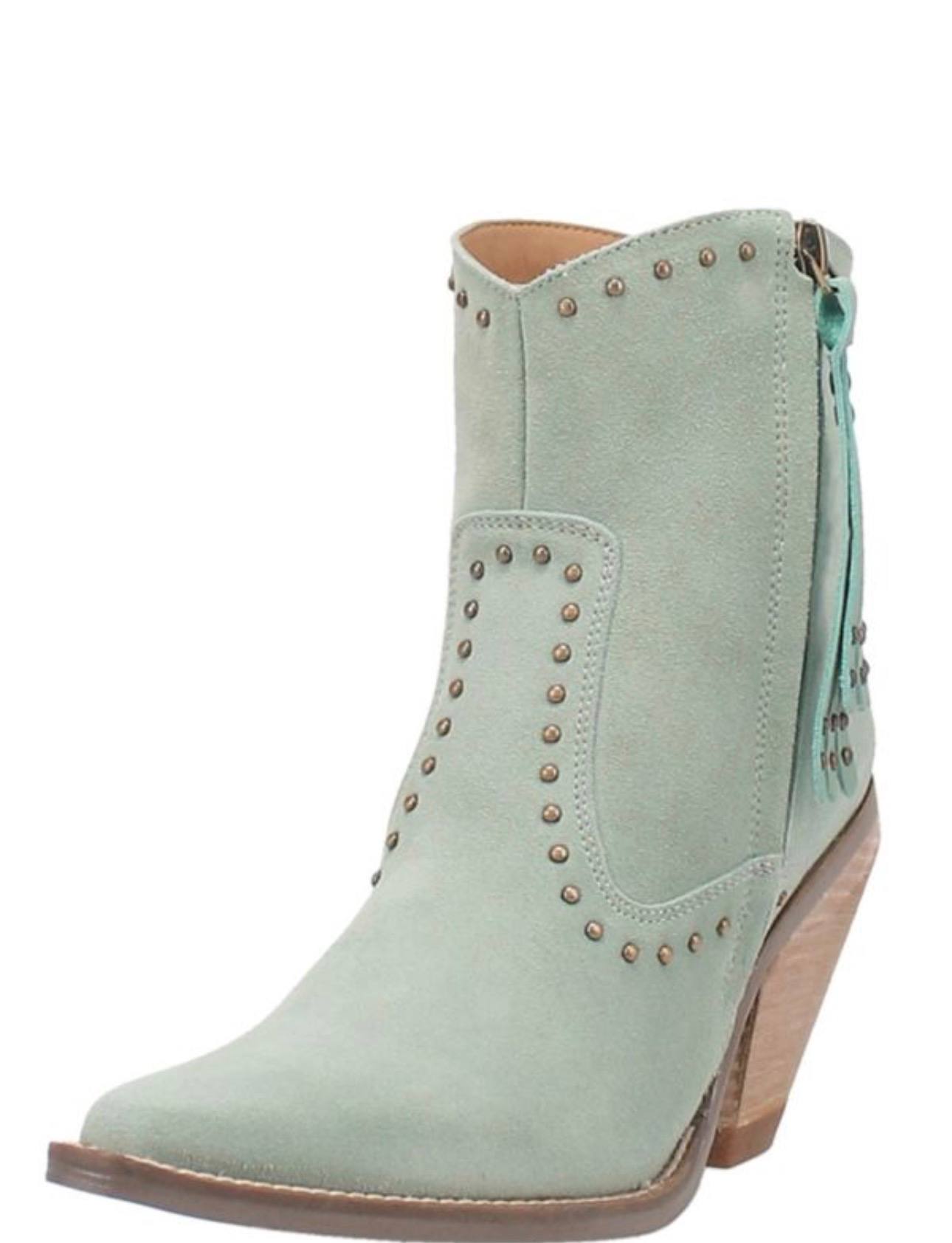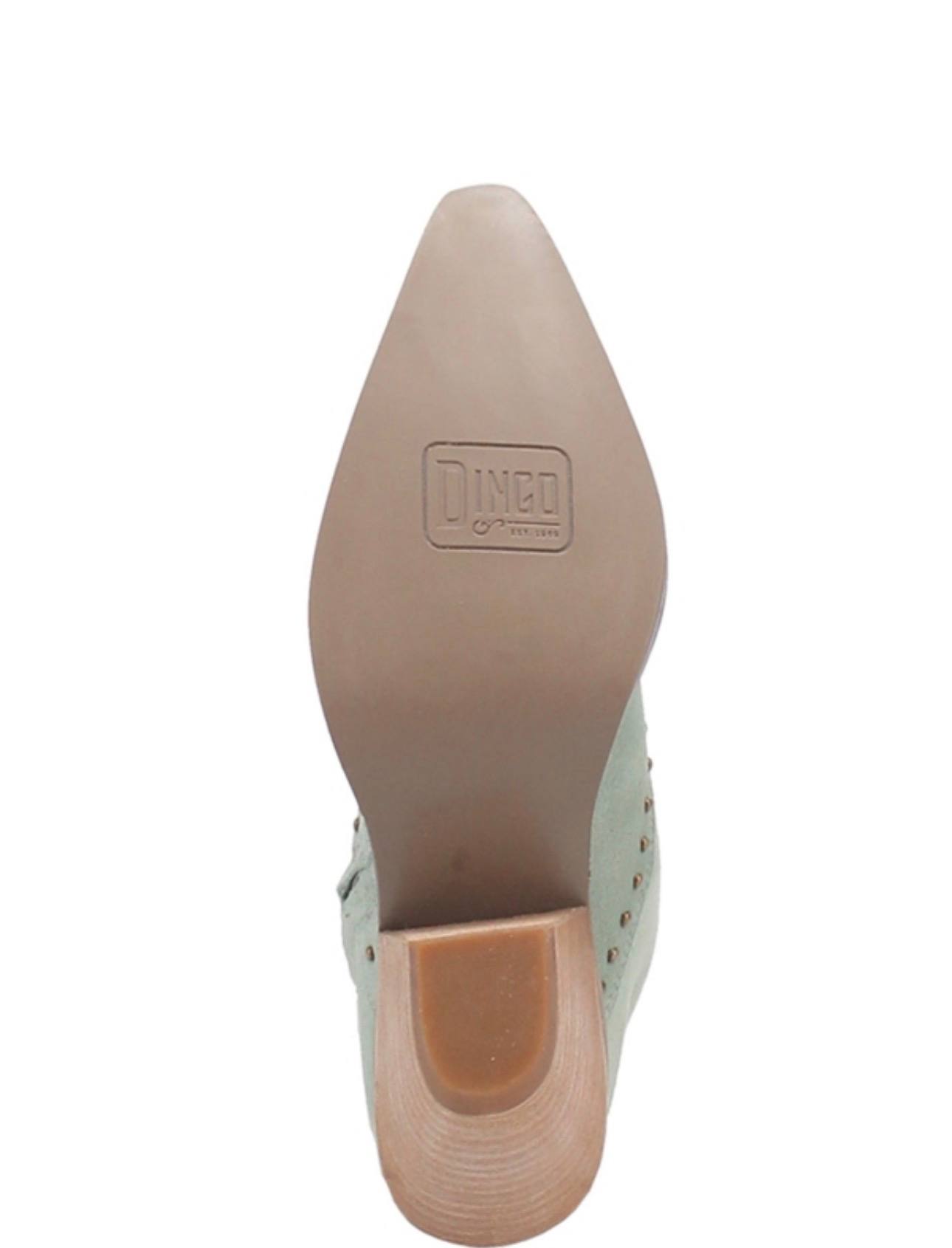 A sassy, comfortable mint suede western ankle bootie from Dingo — classy style with a fun twist.