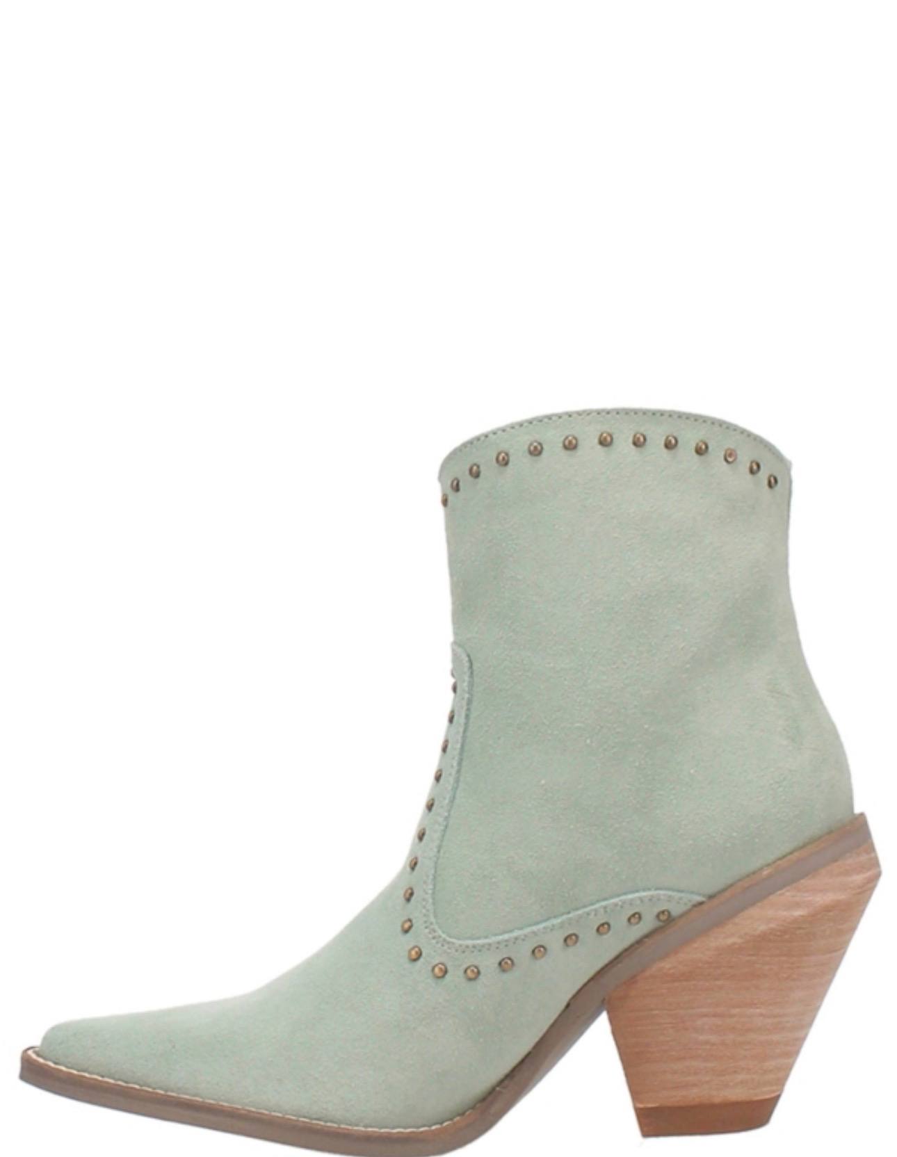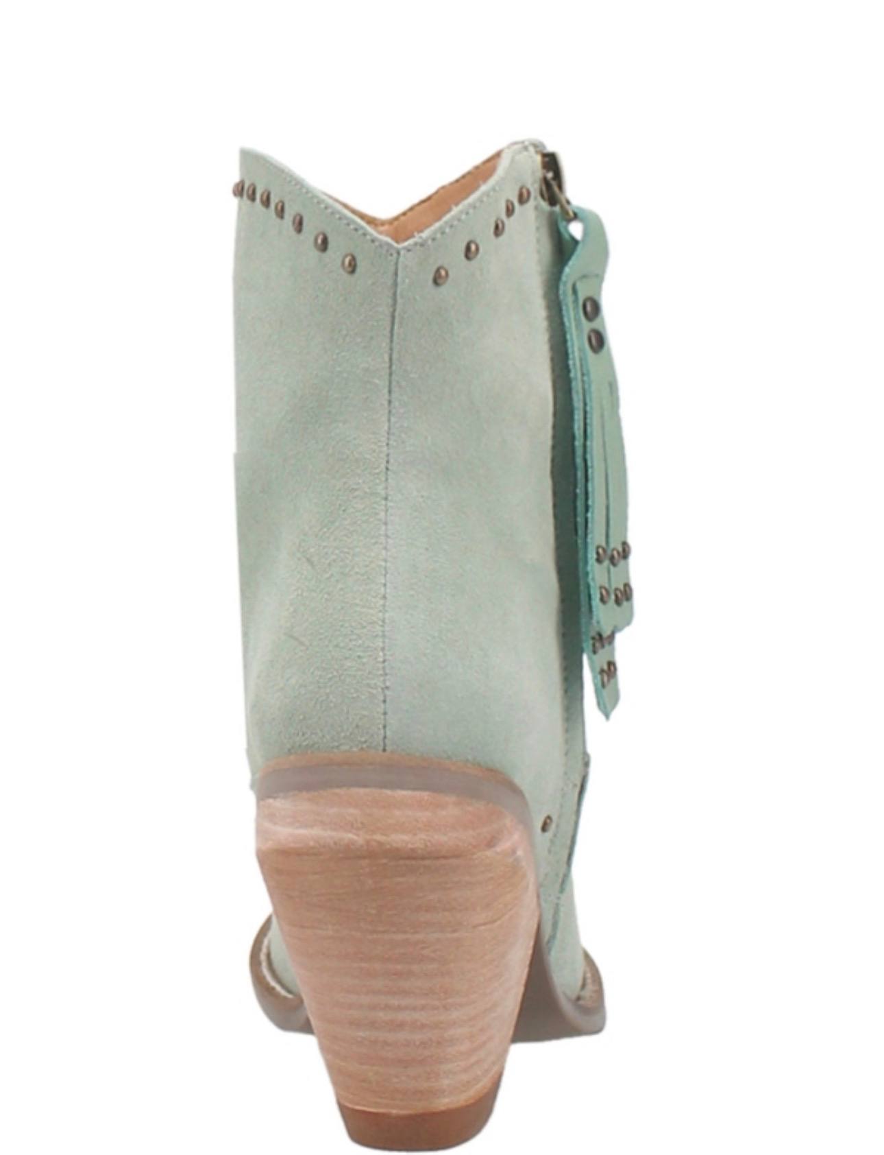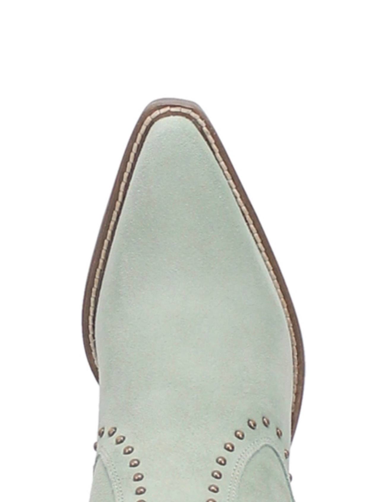 A sassy, comfortable mint suede western ankle bootie from Dingo — classy style with a fun twist.